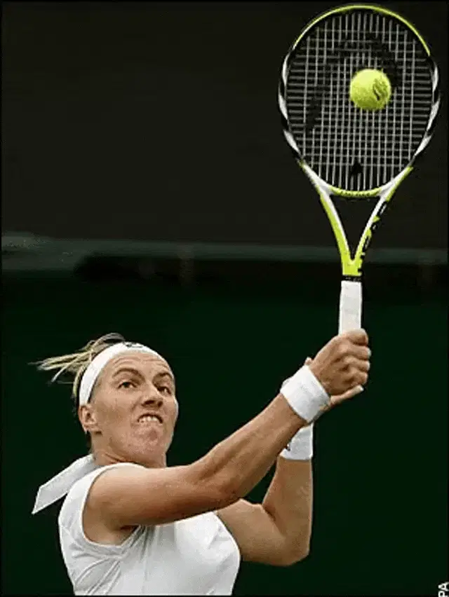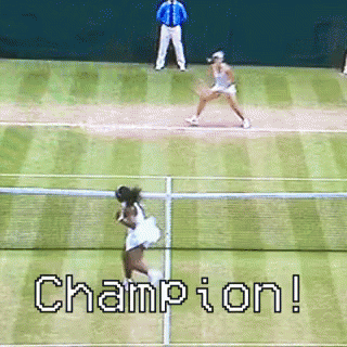 Serena Williams celebrates after winning a championship point at Wimbledon, dropping her racket and falling to the grass court.