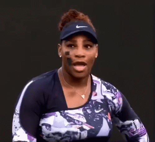 Serena Williams shows a shocked and surprised expression during a tennis match.