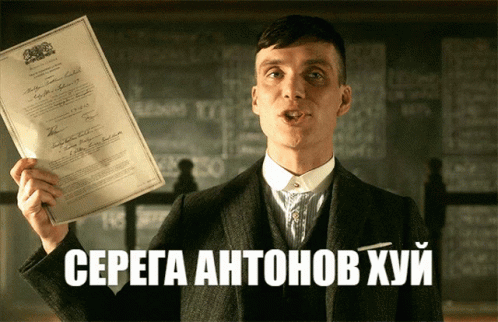Sergey Thomas Shelby holding a document with 'Sergey Antonov' text, smiling confidently.