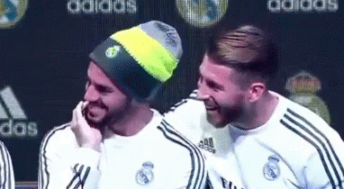 Sergio Ramos and Isco Alarcón sharing a laugh, wearing Real Madrid gear at an event.