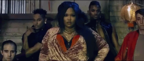 Lizzo stands with a serious expression and a blank stare, exuding a fierce and queen-like presence.