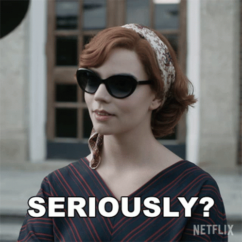 Anya Taylor-Joy, as Beth Harmon, asks 'Seriously?' with a skeptical look, wearing sunglasses and a headscarf.