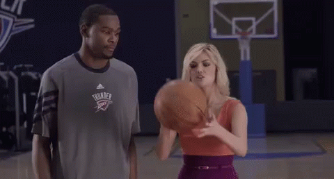 Kate Upton and Kevin Durant interact on a basketball court, with Kate holding a basketball.