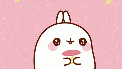Molang, the cute cartoon rabbit, with shiny eyes and a pink background filled with floating mushrooms.