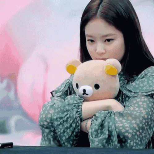 Jennie from BLACKPINK, identified as Seulisasoo Jennie, holds a cute teddy bear and smiles warmly.