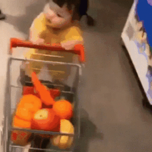 Cute Seulisasoo Korean kid happily pushing a toy shopping cart filled with colorful fruits and vegetables.