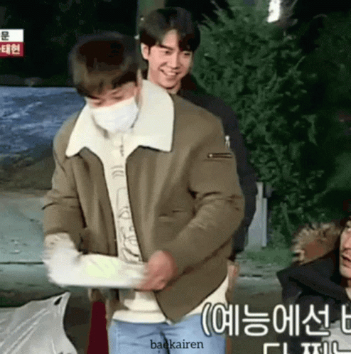 Lee Seung-gi bursts into excited laughter while standing next to another man, enjoying a moment on a show.