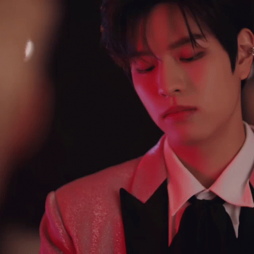Stray Kids members Seungmin and Felix in stylish suits, looking intently in a dimly lit, red-hued setting.