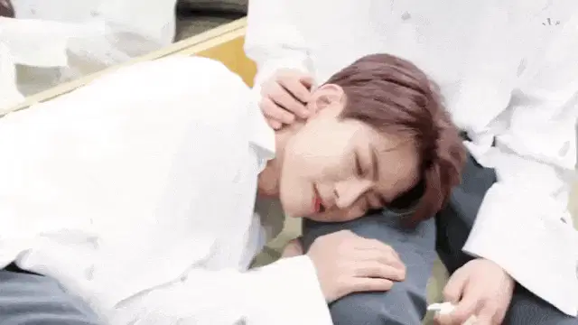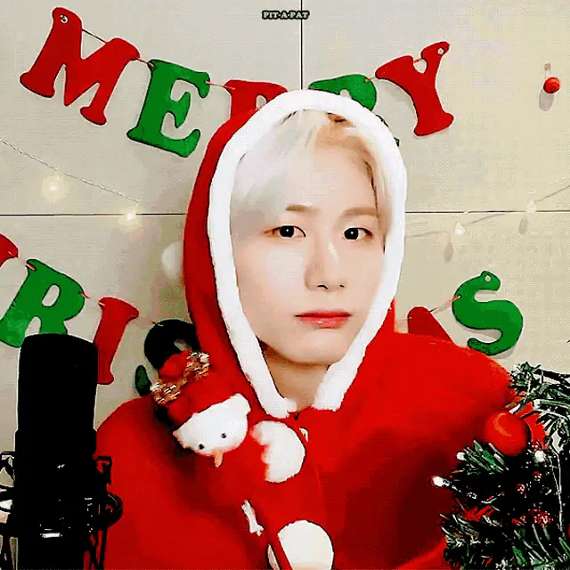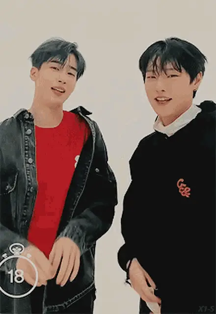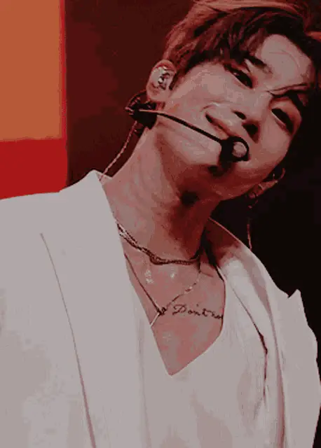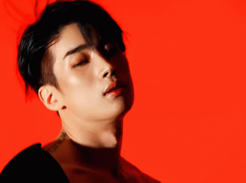 Seungwoo Hanseungwoo striking a dramatic pose against a vibrant red background, showcasing his 'MCMXCII' neck tattoo.