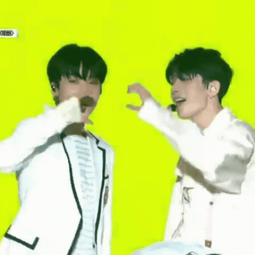 K-pop idols Seungwoo and Eunsang from X1 make a heart gesture on stage during a performance.