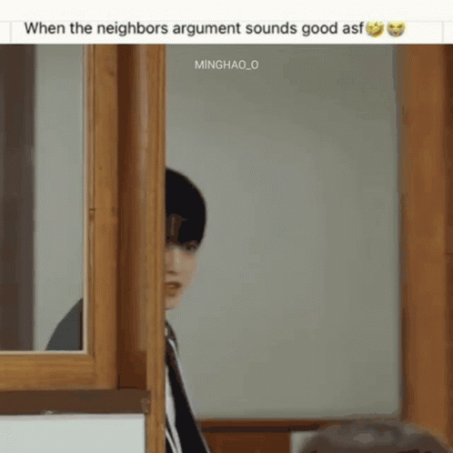 K-pop group Seventeen members peeking around a door, reacting to a neighbor's argument with curious and amused expressions.