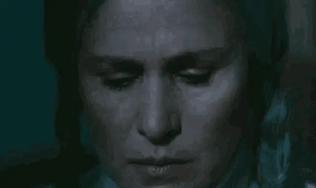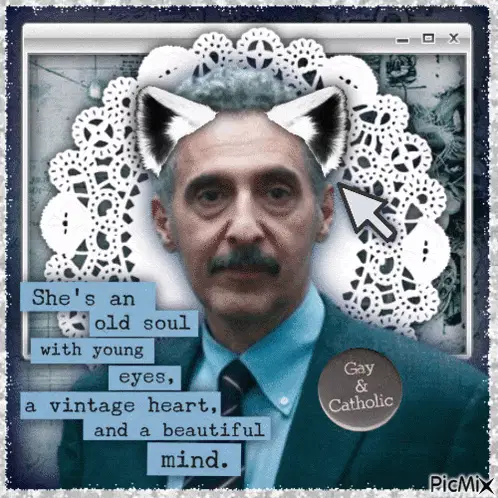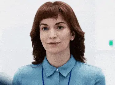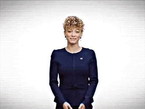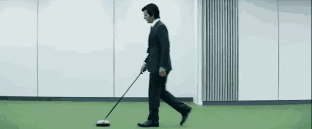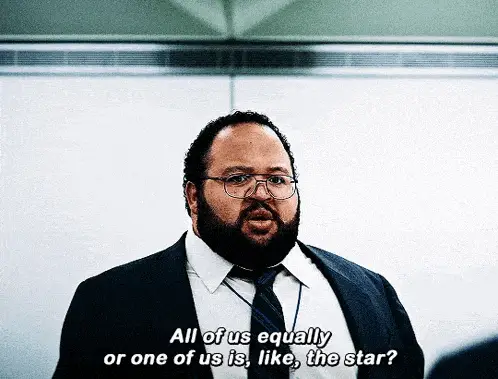 Milchick from Apple TV's Severance series dancing energetically in a white turtleneck.