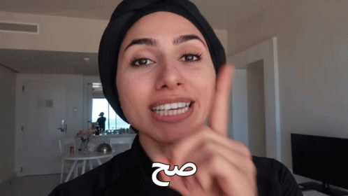 Zainab Al Eqabi smiles and points, confirming 'صح أكيد'.