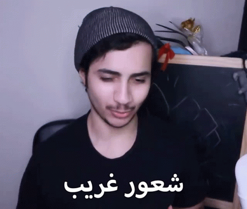 Khalaf, wearing a beanie and black shirt, expresses a strange feeling with Arabic text overlay.