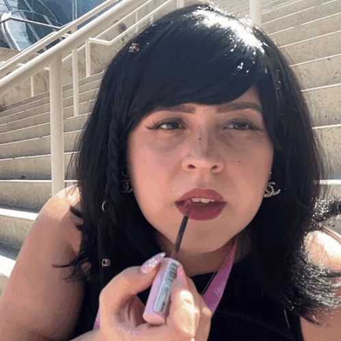 Shagarita Shalymar, also known as Shalymar Rivera, applies a dark red liquid lipstick outdoors.
