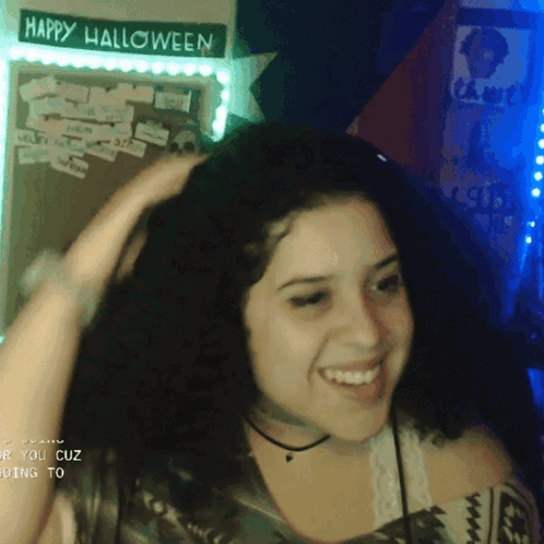 Shagarita Shalymar is excited for a Halloween party, smiling in front of a 'Happy Halloween' sign.