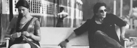 Shah Rukh Khan and Madhuri Dixit share a joyful moment dancing in the rain, smiling at each other.