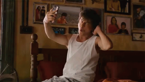 Shah Rukh Khan from the movie Zero takes a playful selfie, striking a pout pose on his bed.