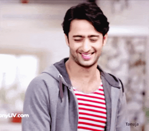 Shaheer Sheikh smiling, wearing a grey hoodie and striped shirt.