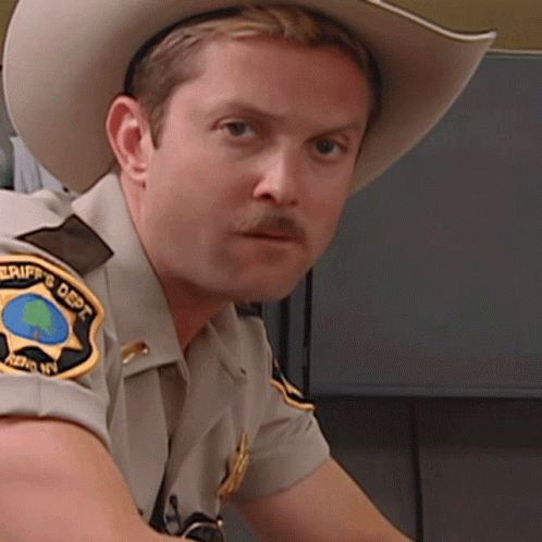 Lieutenant Jim Dangle, played by Thomas Lennon, shakes his head in disapproval while wearing his sheriff's uniform and cowboy hat.