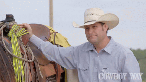 Booger Brown, wearing a cowboy hat, shakes his head while holding a rope near a horse saddle.