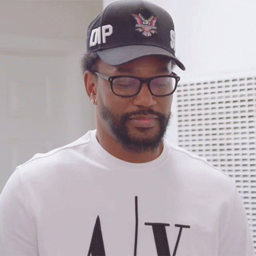 Cam'ron, wearing glasses and a "DIP" hat, shakes his head to indicate "no" or "no way".