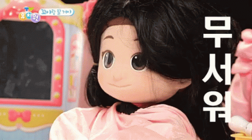 Kkoya the doll is scared and shaking in a hair salon setting from the Korean children's show Tv Kindergarten.