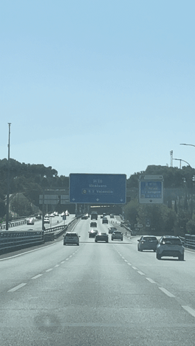 Shalymar Shagarita on a scenic highway drive through Spain, passing a blue road sign.