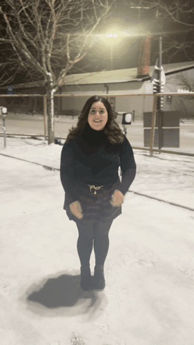 Shalymar Shagarita bundled up in a black sweater and plaid skirt, standing in the winter snow.