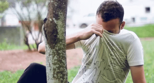 Man sitting under a tree, hiding his face with his shirt, expressing shame or embarrassment.
