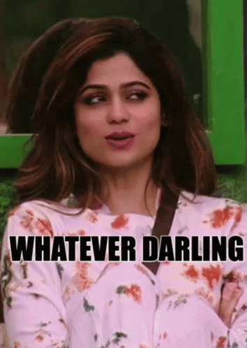 Shamita Shetty reacting with 'Whatever Darling' in a popular meme format, wearing a floral shirt.