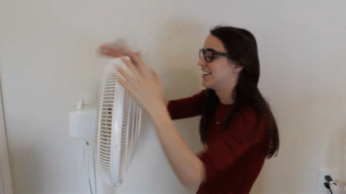 Shancan, wearing glasses, smiles while using a white fan to cool down from the heat.