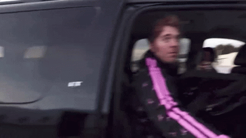 Shane Dawson looking surprised while sitting in the back of a black SUV.
