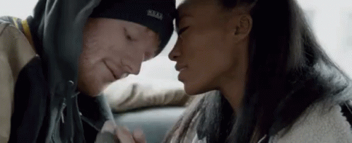 Ed Sheeran shares an intimate moment with a woman, touching foreheads in a scene from 'Shape Of You'.