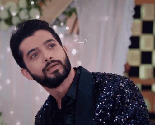 Sharad Malhotra as Veeranshu Singhania, looking thoughtful in a sparkling black jacket.