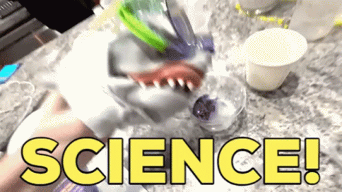 A person holds a Shark Puppet toy that says "SCIENCE!" during an experiment with various lab items.