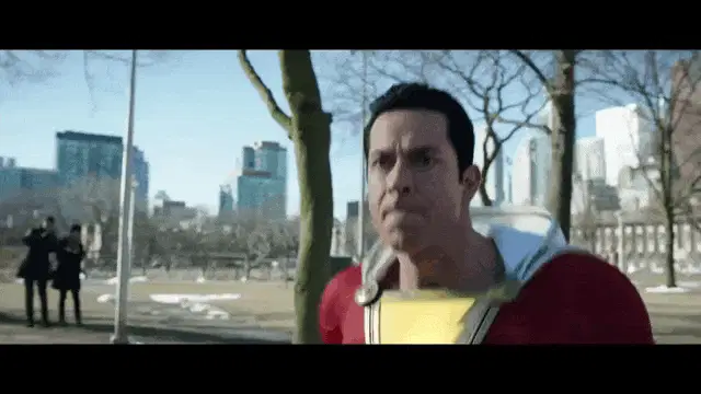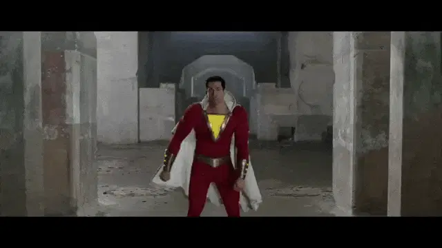 Jack Dylan Grazer as Freddy Freeman excitedly films Zachary Levi as Shazam in a convenience store scene from Shazam! The Movie.