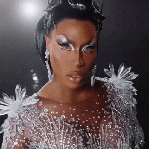 Shea Coulee in a stunning crystal-embellished gown and dramatic makeup, showcasing a fierce and regal look.