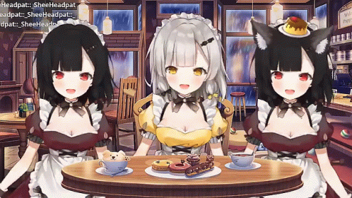 three anime maids are sitting at a table with cups of tea and donuts