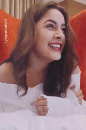 Shehnaaz Gill laughing joyfully while sitting on a red couch, wearing an off-shoulder white top.