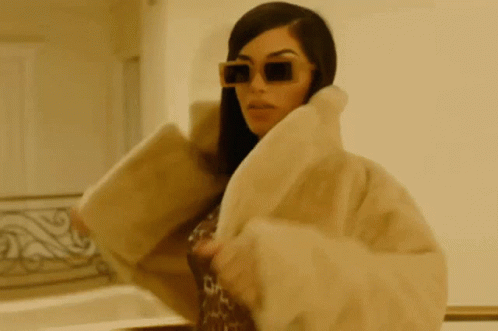 Kimberlyloaiza poses in a stylish Shein fur coat and rectangular sunglasses in a warm-toned setting.