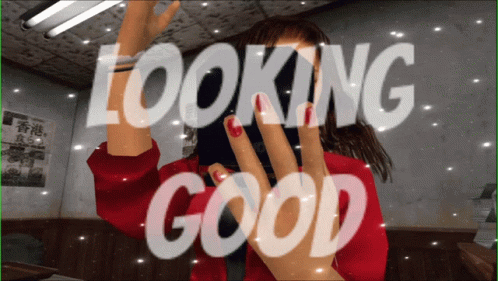 A Shenmue character, a woman in a red jacket, checking her appearance with 'LOOKING GOOD' text.