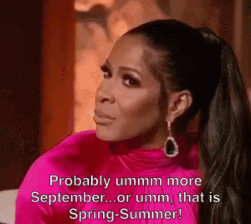 Sheree Whitfield discusses fashion seasons, stating 'Probably ummm more September...or umm, that is Spring-Summer!'