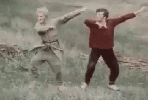 Two men, associated with "შერეკილები" and "ნინისჯგუფი", dance energetically outdoors in a field with outstretched arms.