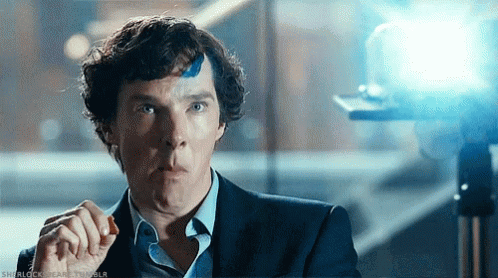 Sherlock Holmes chews intently, a blue mark on his forehead, illuminated by a bright light.