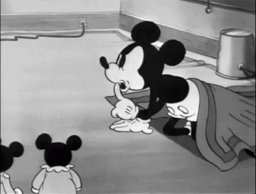 Mickey Mouse, covered in a blanket, shushes his children to keep quiet in this classic cartoon scene.