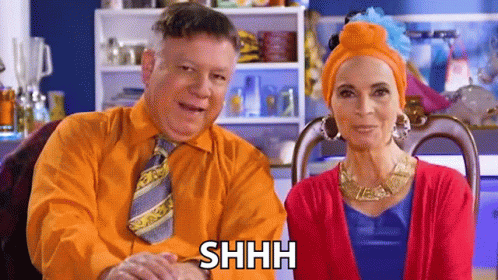 Macaria makes a 'shhh' gesture while sitting next to a man, wearing an orange turban and red cardigan.