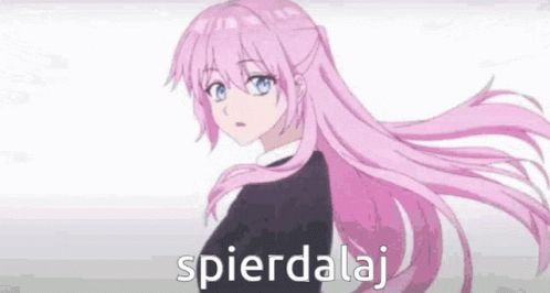 Shikimori, an anime girl with pink hair and blue eyes, stands against a pink background with the Polish word 'spierdalaj' (fuck off) displayed.