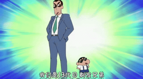 Shinchan and a man, possibly his father, strike a cool pose in suits and sunglasses from the anime series.