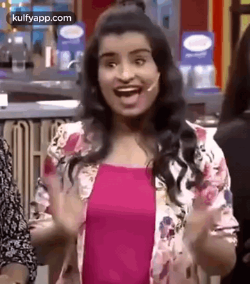 Shivangi makes a hilarious and exaggerated funny expression on a TV show set, wearing a pink top and floral jacket.